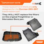 - For Dorman pan only - the filters in this kit are designed to fit only our Dorman OE FIX 265-887 transmission pan; they will not replace the filters on the OE Freightliner or Mercedes-Benz pan