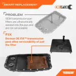 - Description: When the factory transmission fluid filter requires servicing on certain vehicles, you have to replace the entire oil pan. This Dorman OE FIX replacement features a serviceable filter for easier future service, with all necessary hardware.