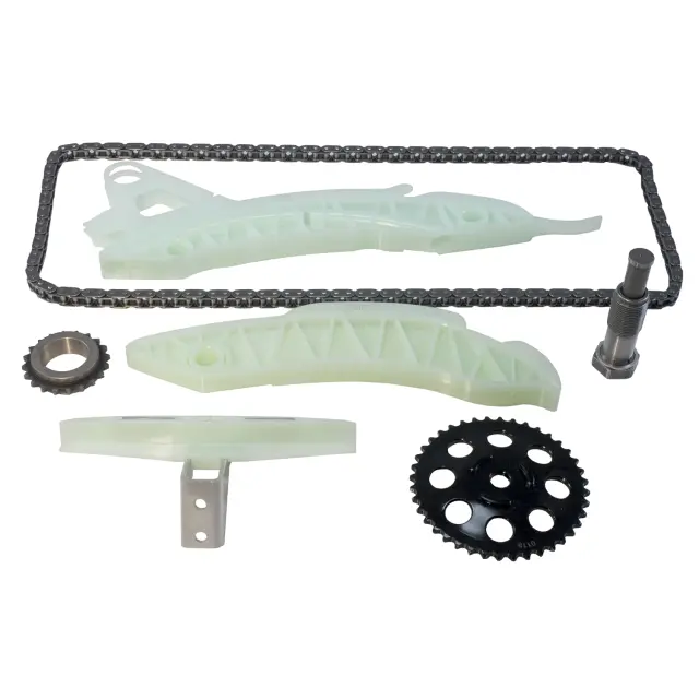 - Description: Melling timing set includes timing chain (1), timing chain guide (2), timing chain tensioner (1), timing chain tensioner guide (1), crankshaft sprocket (1), and camshaft sprocket (1) for 7 pieces in this kit. Melling timing chain kits provide an efficient and economical way to provide the timing components needed for a quality engine rebuild. Timing chain options include both standard and roller chains to provide matches with the high quality sprockets and if necessary tensioners and guides that fit the application. Both OEM and performance timing chain kits are available. Melling chains and sprockets are manufactured using the highest designs, quality materials and workmanship. Melling chain kits offer you the coverage and choices of standard, HD and performance to fulfill your timing needs at every service level.