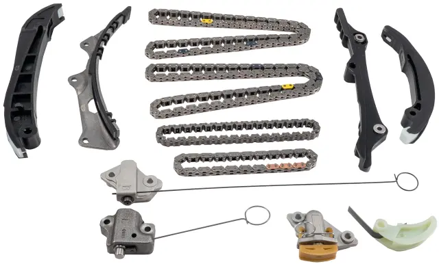 - Description: Made in USA. Melling timing set includes timing chain (4), timing chain tensioner (4), timing chain tensioner arm (2), and timing chain guides (2) for 12 pieces in this kit. Melling timing chain kits provide an efficient and economical way to provide the timing components needed for a quality engine rebuild. Timing chain options include both standard and roller chains to provide matches with the high quality sprockets and if necessary tensioner and guides that fit the application. Both OEM and performance timing chain kits are available. Melling chains and sprockets are manufactured using the highest designs, quality materials and workmanship. Melling chain kits offer you the coverage and choices of standard, HD and performance to fulfill your timing needs at every service level.