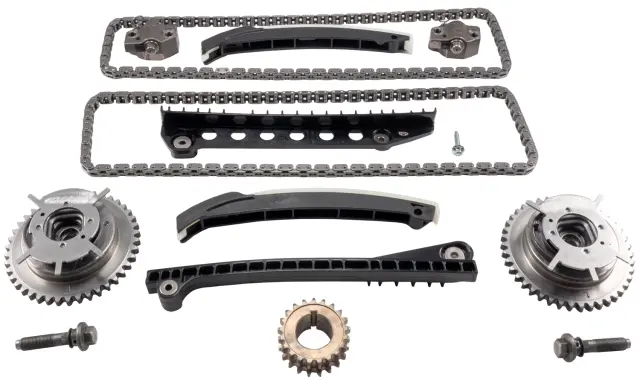 - Description: Made In USA. Melling timing set includes timing chain (2), timing chain guide (2), timing chain tensioner (4), crankshaft sprocket (1), and variable valve timing sprocket (2) for 11 pieces in this kit. Made In USA. Melling timing chain kits provide an efficient and economical way to provide the timing components needed for a quality engine rebuild. Timing chain options include both standard and roller chains to provide matches with the high quality sprockets and if necessary tensioner and guides that fit the application. Both OEM and performance timing chain kits are available. Melling chains and sprockets are manufactured using the highest designs, quality materials and workmanship. Melling chain kits offer you the coverage and choices of standard, HD and performance to fulfill your timing needs at every service level.