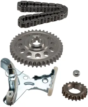 - Description: Melling timing set includes timing chain (1), oil galley plug (1), timing chain tensioner (1), crankshaft sprocket (1), and camshaft sprocket (1) for 5 pieces in this kit. Melling timing chain kits provide an efficient and economical way to provide the timing components needed for a quality engine rebuild. Timing chain options include both standard and roller chains to provide matches with the high quality sprockets and if necessary tensioner and guides that fit the application. Both OEM and performance timing chain kits are available. Melling chains and sprockets are manufactured using the highest designs, quality materials and workmanship. Melling chain kits offer you the coverage and choices of standard, HD and performance to fulfill your timing needs at every service level.