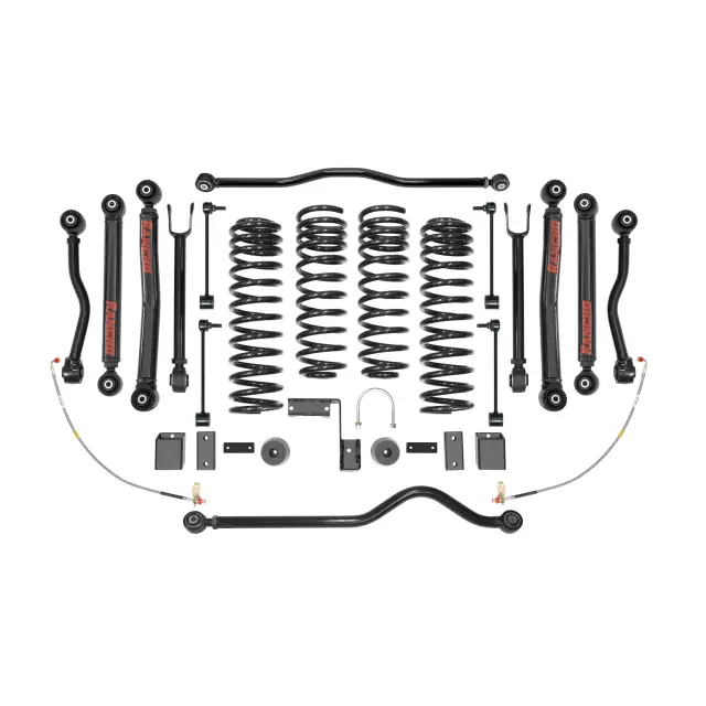 - COMPLETE SOLUTION -- Kit includes front and rear progressive rate coil springs, upper and lower control arms, heavy-duty front and rear adjustable track bars, extended sway bar end links, bump stop spacers and mounting hardware